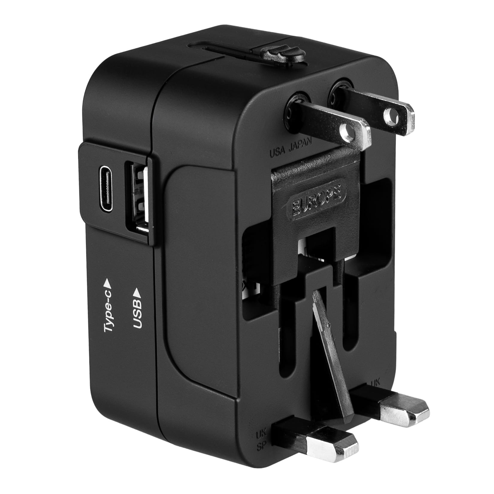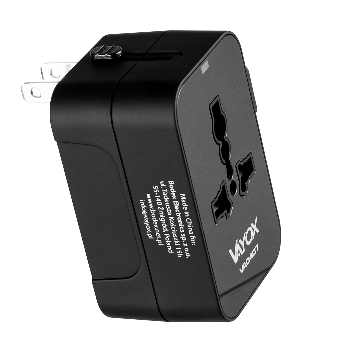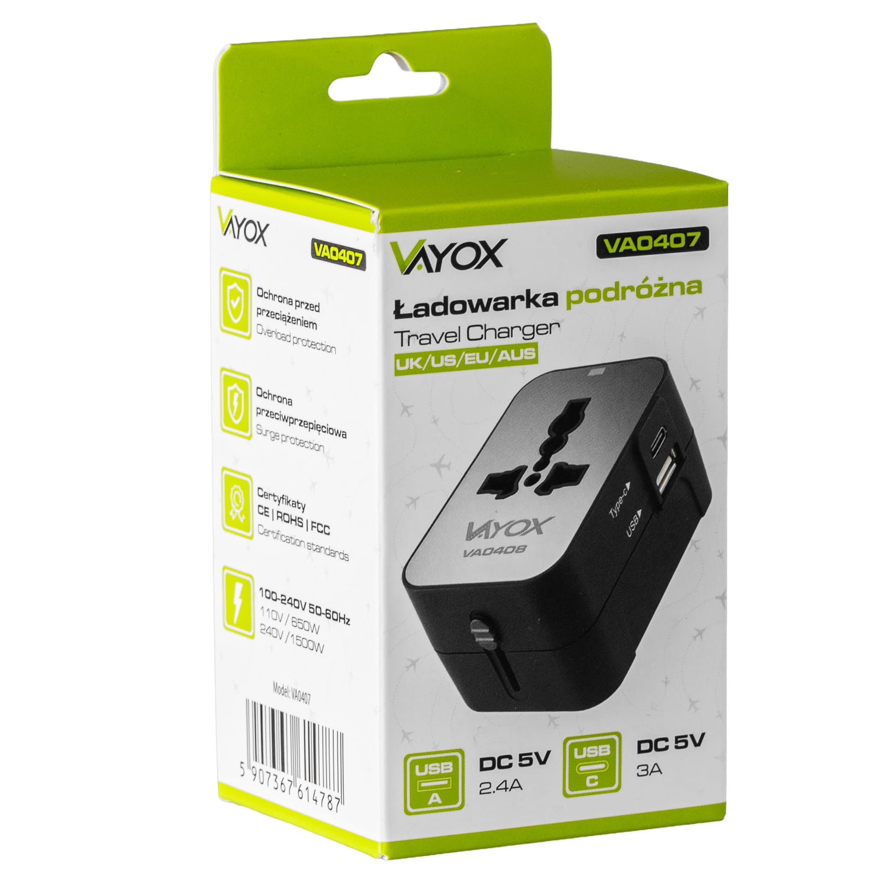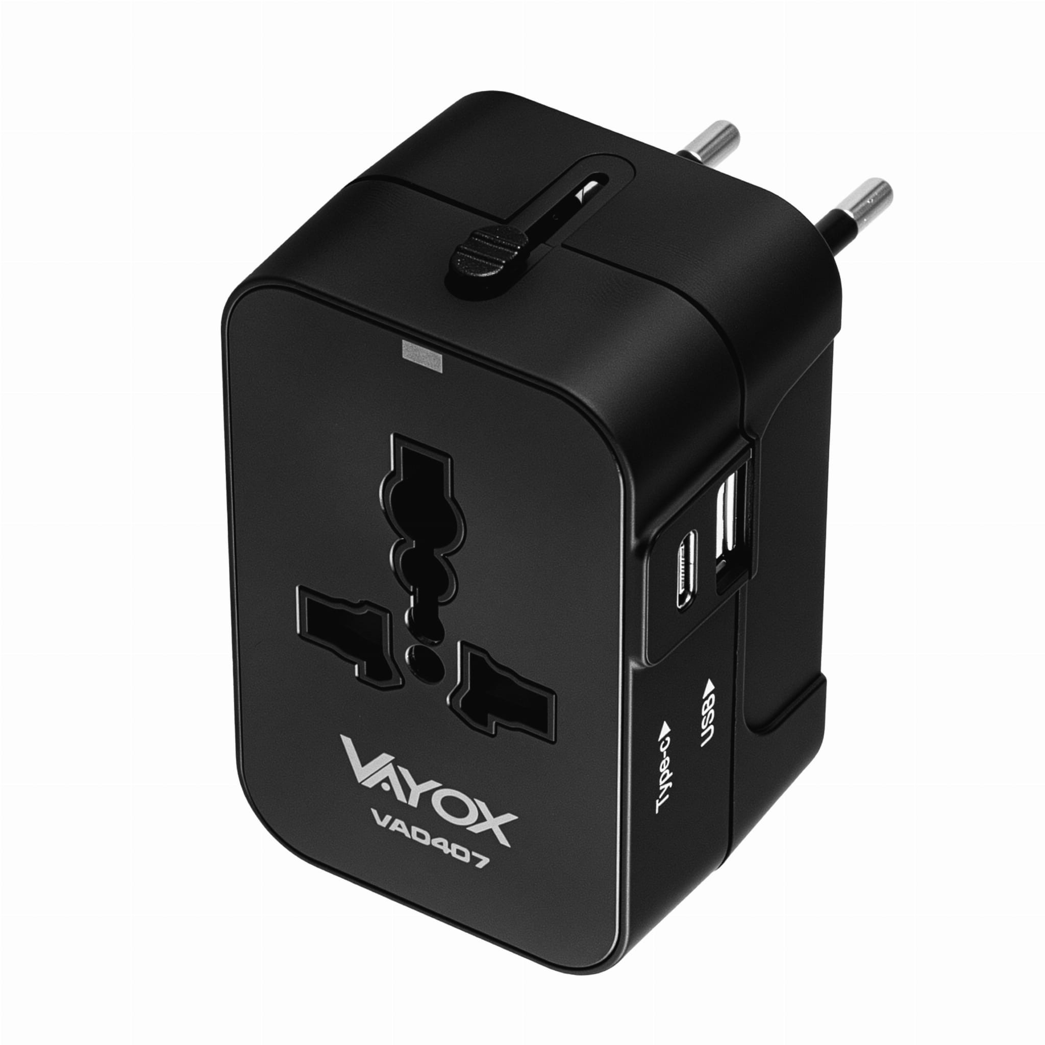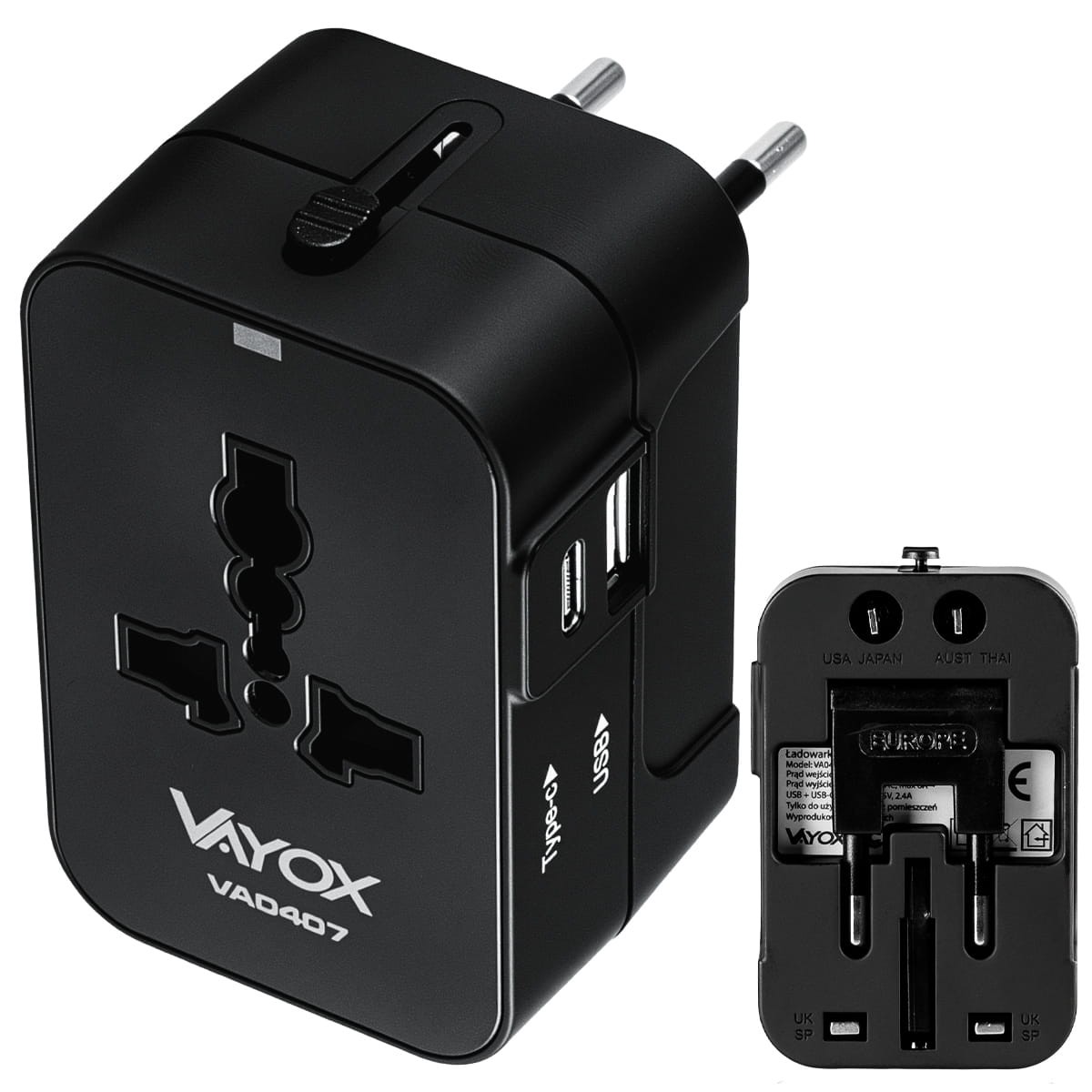 Adapter podróżny UK/US/EU/AU, USB-A, USB-C 100V-240Vac 6A 1500W czarny VA0407 Vayox
