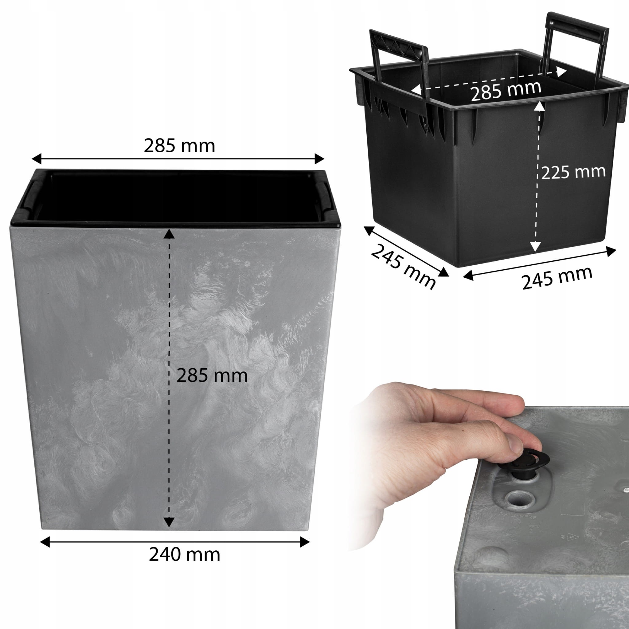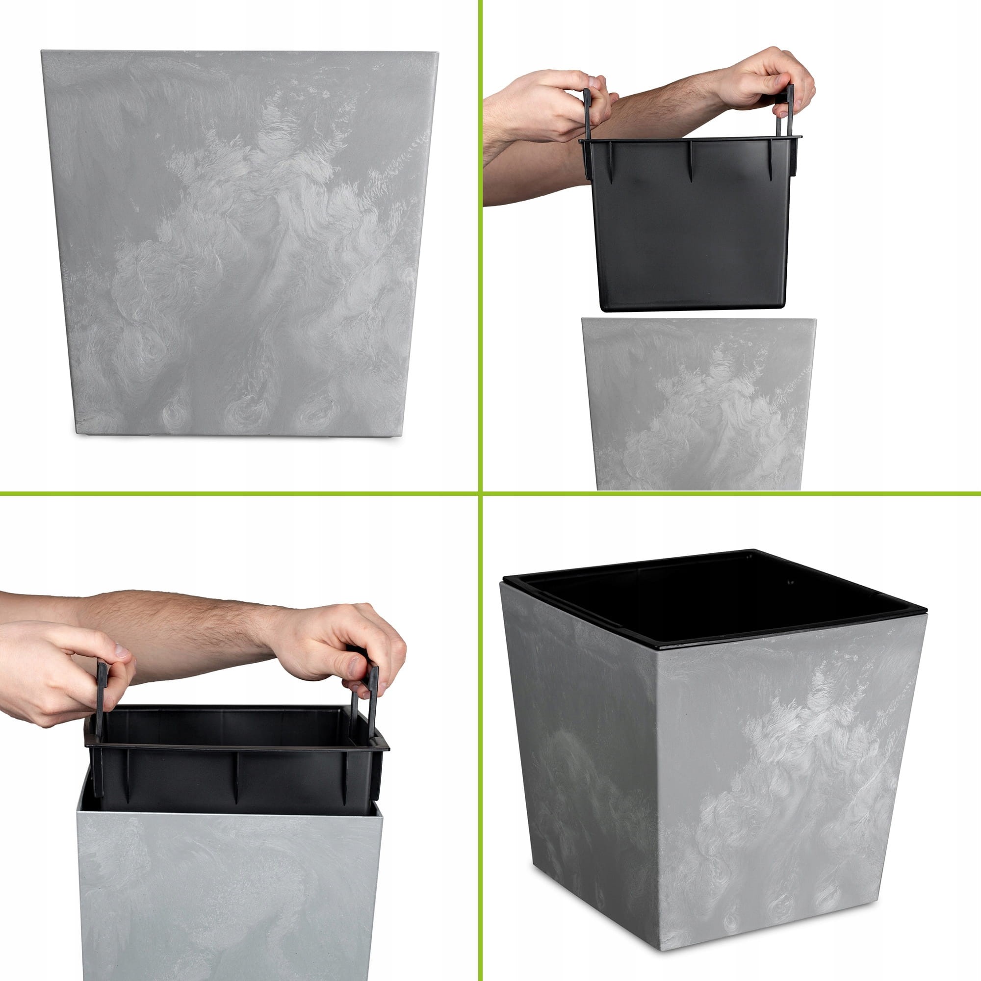 Wkład wewnętrzny w zestawie do doniczek pozwala na zmniejszenie przestrzeni wewnętrznej a tym samy wykorzystanie mniejszej ilości ziemi, system do nawadniania przeznaczony jest do zamontowania we wkładzie wewnętrznym.