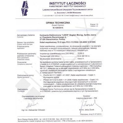 Nasz kabel został przebadany w Polskim Instytucie Łączności gdzie zostały potwierdzone jego parametry w warunkach laboratoryjnych.