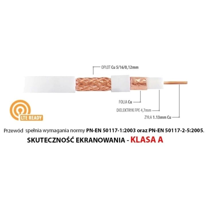 Wybierając przewód, pamiętaj aby zwrócić uwagę na jego jakość. Tanie kable najczęściej nie nadają się do stosowania na zewnątrz, szybko się kruszą przez co tracą swoje właściwości, a także posiadają znikomy oplot, co może sprawić, że sygnał o częstotliwości powyżej 790MHz będzie trafiał do przewodu generując zakłócenia w odbiorze. Problem ten z miesiąca na miesiąc będzie się nasilał ze względu na sieć LTE. Warto mieć na uwadze to, że problem z odbiorem telewizji może być spowodowany nawet zbyt bliską obecnością Twojego smartfonu korzystającego z internetu w pobliżu przewodu antenowego - dlatego tak ważne jest wybranie kabla z dobrym oplotem!