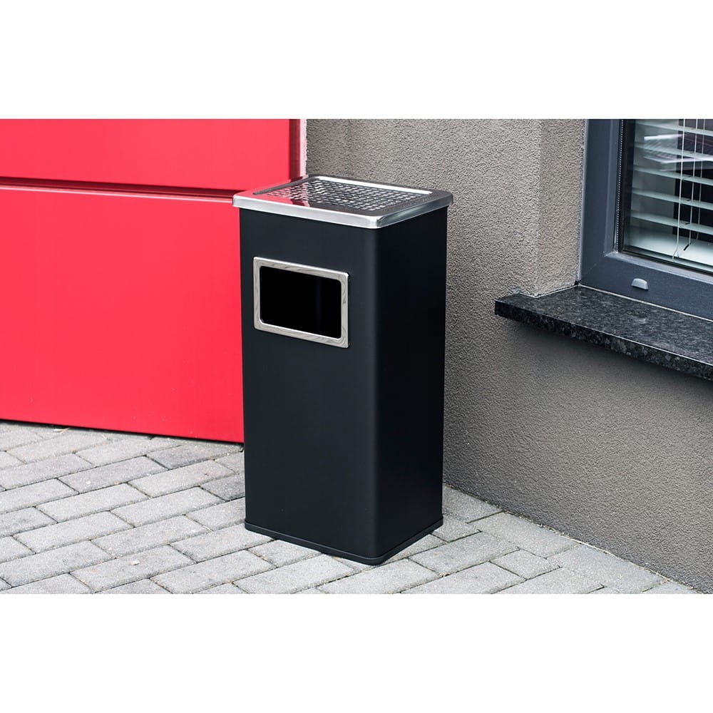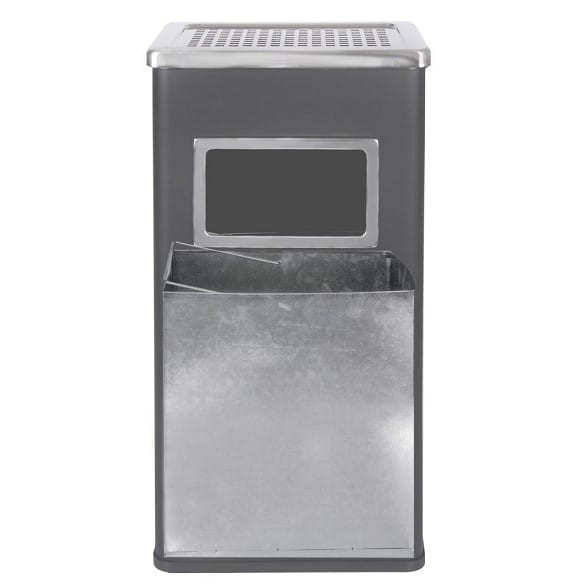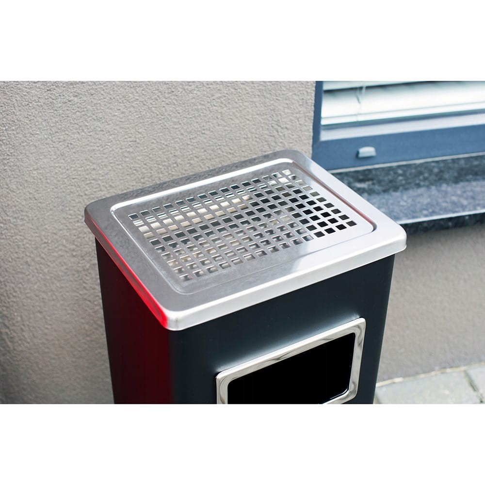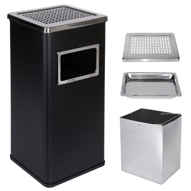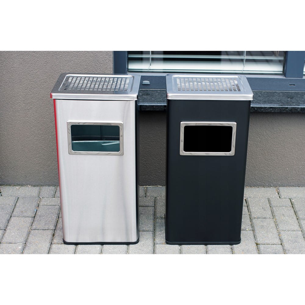 Solidna i elegancka koszopopielnica stojąca. Została wykonana z wysokiej jakości stali nierdzewnej co jest gwarancją długiego użytkowania. Pojemnik został wyposażony w ażurową pokrywę, która umożliwia niezwykłe łatwe i sprawne usuwanie niedopałków oraz popiołu z popielnicy. Wewnątrz części metalowej znajduje się kosz na odpady dzięki temu może służyć również jako zwykły kosz na śmieci.