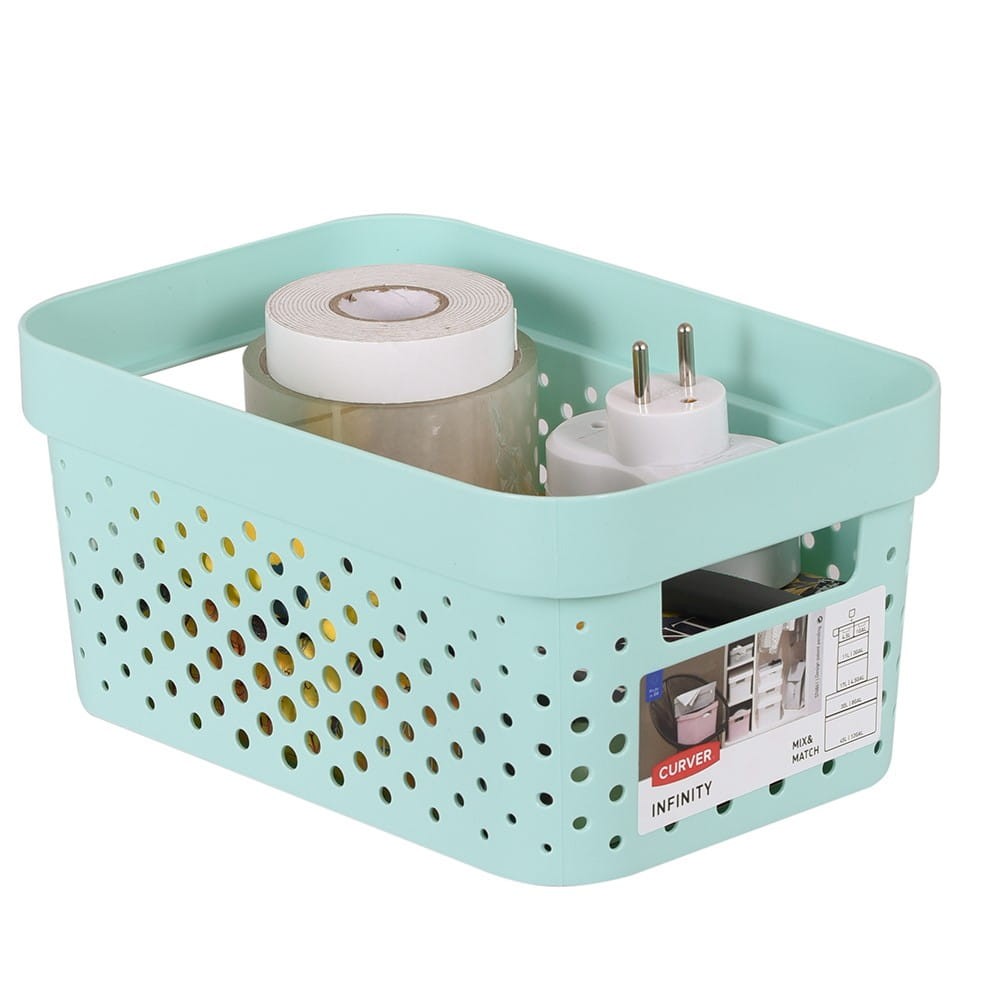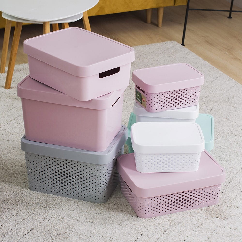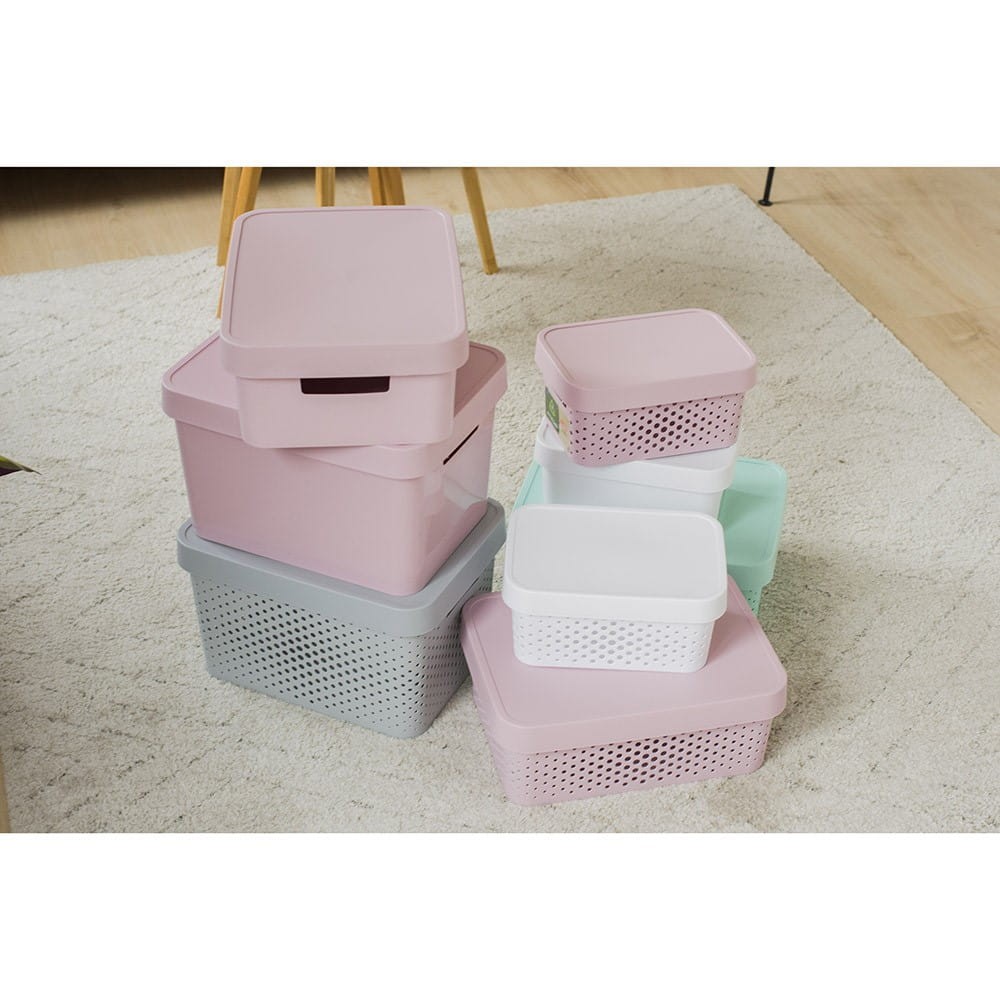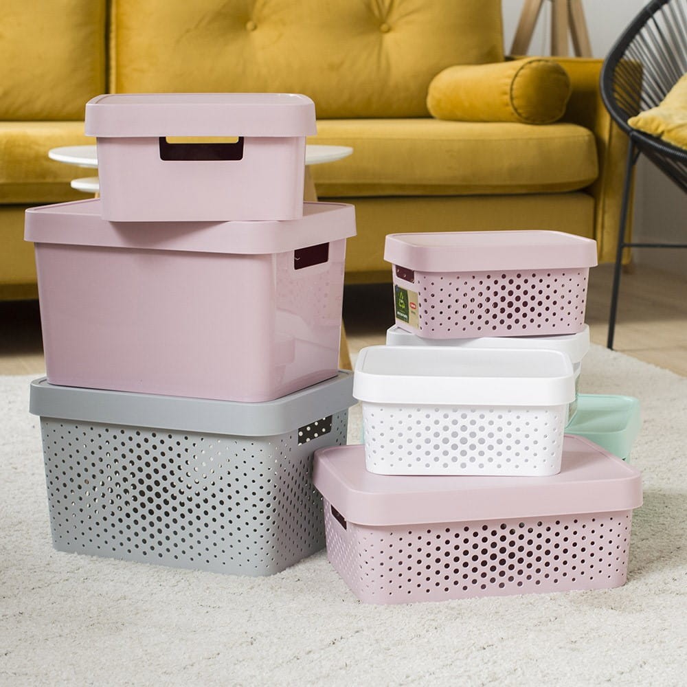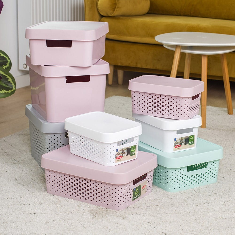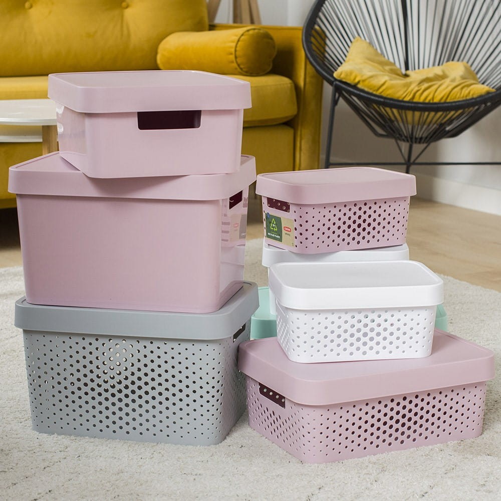Seria pojemników Infinity to pewność porządku i to w dobrym stylu. Przechowamy w nim zapasy żywności, ubrania, książki, dokumenty. Słowem: absolutnie wszystko! Prezentowany pojemnik posiada przykrywkę o gładkiej powierzchni oraz ażurową strukturę, dzięki której możliwa jest ciągła cyrkulacja powietrza. Projektanci nadali pojemnikowi prosty, ale niebanalny kształt. Można je ustawiać jeden na drugim w dowolnej kombinacji. Idealnie komponuje się ze skandynawskim aranżem wnętrz. W naszej ofercie posiadamy wszystkie rodzaje pudełek i koszy z serii infinity