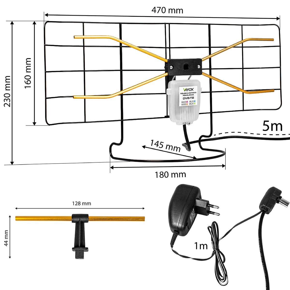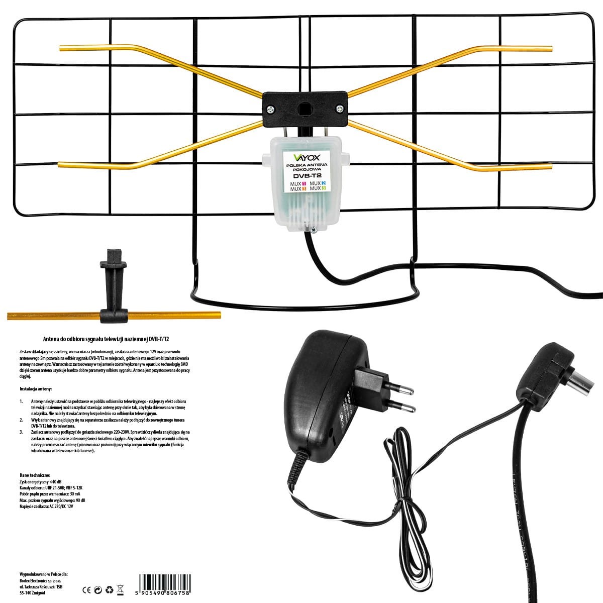 Zestaw składający się z anteny, wzmacniacza (wbudowany), zasilacza antenowego 12V, przewodu antenowego 5m