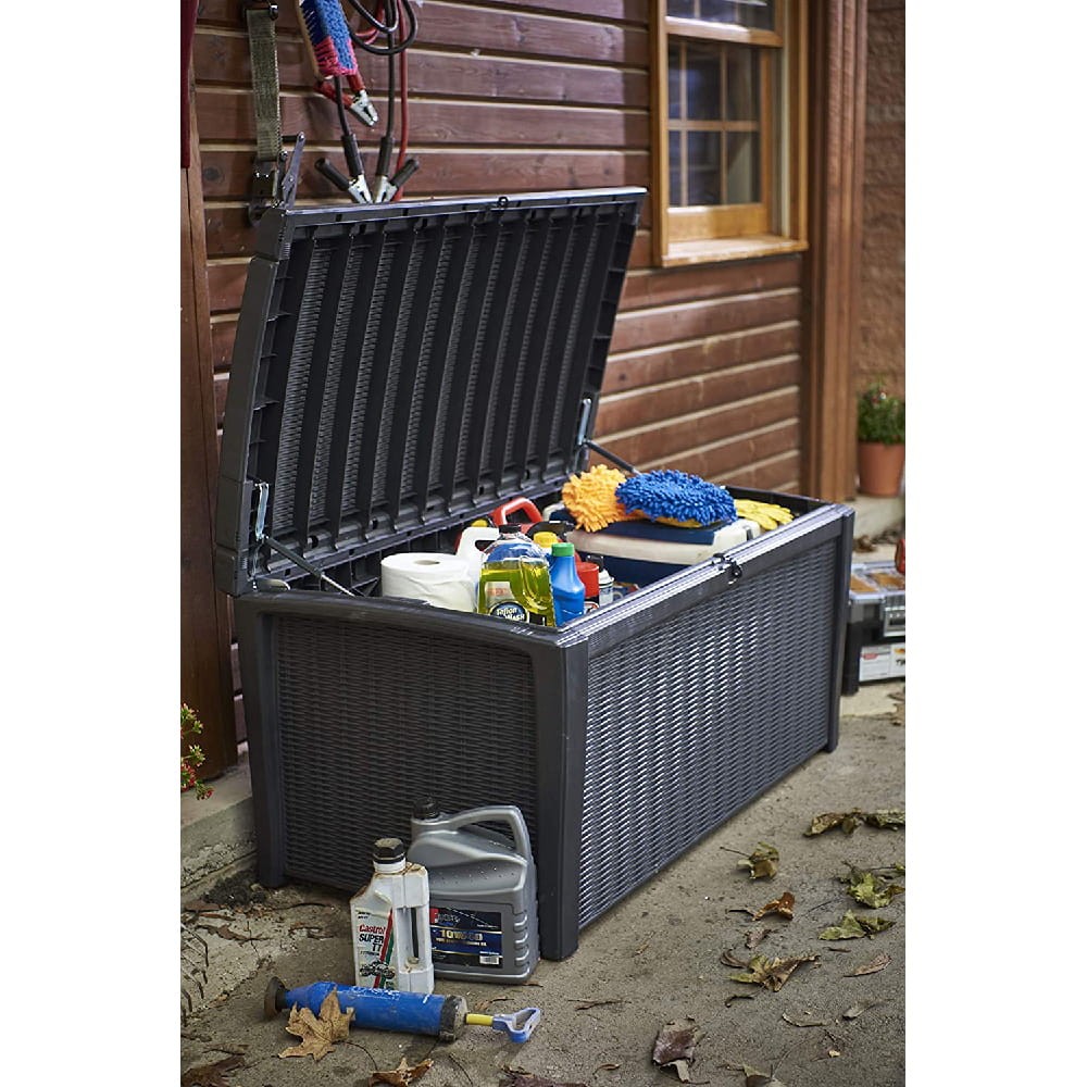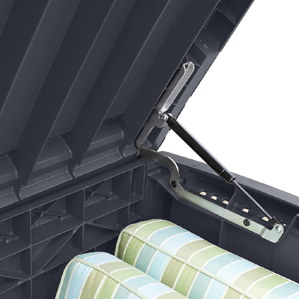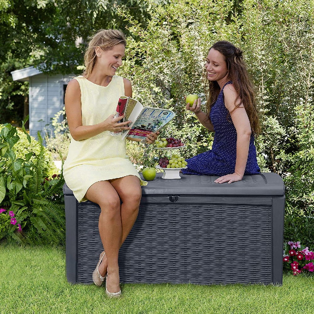 - Skrzynia posiada aż 416 litrów pojemności - wystarczająco, by zmieścić najpotrzebniejsze ogrodowe akcesoria (dopuszczalna ładowność do 50kg)