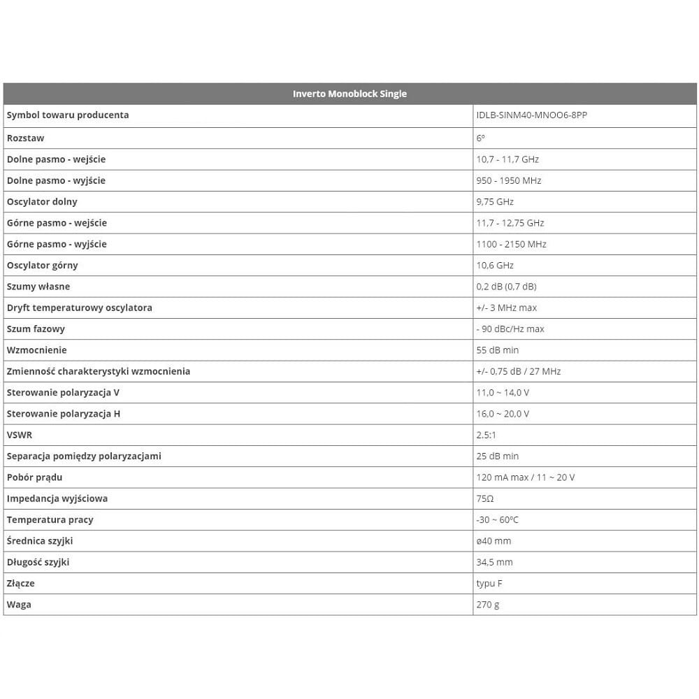 Konwerter Monoblock Single to produkt znanej luksemburskiej firmy INVERTO, która jest liderem wśród dostawców konwerterów na polski rynek. Urządzenie posiada 2 konwertery w jednej obudowie, które połączone są za pomocą switcha z jednym wyjściem żeńskim typu F. Monoblock Single 40mm został zatem zaprojektowany z myślą o podwójnym odbiorze satelitarnym. Dzięki temu możliwy jest jednoczesny odbiór sygnału z dwóch satelitów oddalonych od siebie o 6º (np. ASTRA - 19º i HOTBIRD - 13º). Monoblock dostarcza sygnał satelitarny dla dwóch jednogłowicowych tunerów DVB-S/S2, lub jednego tunera dwugłowicowego PVR. Aby uzyskać optymalny sygnał dedykowana do urządzenia czasza powinna mieć rozmiar 80 cm. Najważniejszymi cechami wyróżniającymi go spośród innych tego typu urządzeń to: niski współczynnik szumów, małe szumy fazowe, niski pobór prądu, bardzo duża separacja między pomiędzy polaryzacjami i bardzo duża stabilność częstotliwości.