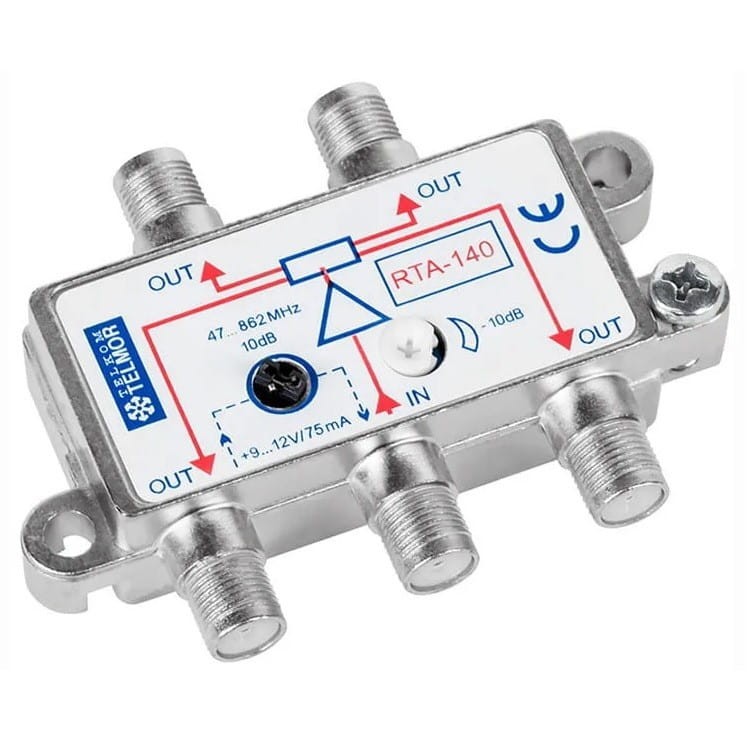 Aktywne rozgałęźniki typu RTA-140 przeznaczone są do pracy w indywidualnych instalacjach dystrybucji sygnałów RTV. Możliwe jest zasilenie sygnałem antenowym lub z TV kablowej czterech odbiorników telewizyjnych. Rozgałęźnik ma możliwość regulacji wzmocnienia oraz zworę umożliwiającą przekazanie napięcia zasilania od strony oznakowanego wyjścia (OUT) na wejście (IN). Zasilanie rozgałęźników odbywa się za pośrednictwem kabla koncentrycznego za pomocą opcjonalnego separatora napięcia. RTA-140 został umieszczony w metalowej, solidnej obudowie, która wyposażona jest w standardowe gniazda przyłączeniowe typu „F”. Dzięki temu montaż urządzenia jest niezwykle szybki i prosty.